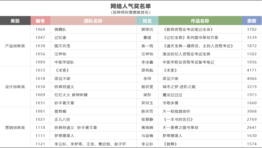 本届图书策划大赛以“逐梦青年,书有新意”为主题,自开赛以来得到了高校的积极响应和大力支持。依据大赛有关规定,并经过一系列公正、严格的评定,评选出3类共49个参赛作品晋级决赛,并结合大赛网络投票结果评选15个 “网络人气奖”,现将晋级决赛及“网络人气奖”获奖名单予以公布。